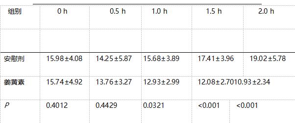 Rasyid 等[ 1 1 ]為比較姜黃素和安慰劑對健康例體膽囊的作用。將12 例受試者分為兩組進行隨機雙盲交叉研究,在給予姜黃素或安慰劑前空腹膽囊容積分別為( 15.74±4.29)mL和(15.98±4.08)mL,二者相似;分別給予20 mg姜黃素或相同量安慰劑后0.5,1.0, 1.5 和2 . 0 h 測量膽囊容積,姜黃素組膽囊容積分別降低了( 11.8±6.9)%,(16.8±7.4)%,(22.0±8.5)%,( 2 9 . 3 ±8 . 3 )% ,安慰劑組在0 . 5 h 后顯著下降,約( 10.9±22.8)%,1.0 h后膽囊容積開始增加,相關(guān)試驗數(shù)據(jù)見表1,試驗表明,姜黃素能夠誘使例體膽囊發(fā)生收縮。